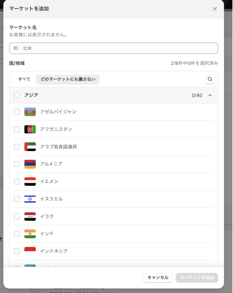 どの国で自分たちの商品を購入可能にするかを設定することができます。ほとんどの主要国の中から、国別またはエリア別に選択でき、多国化展開も非常にしやすい設計となっています。