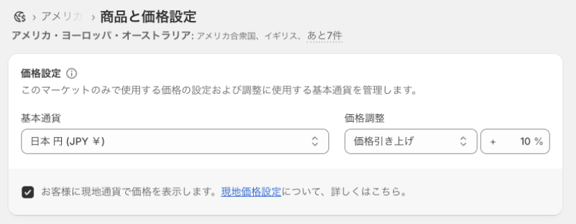 Shopifyでは自動通貨調整機能を活用し、越境ECを訪れた国のユーザーの通貨を表示してくれます。また、現地の通貨に自動で変換するだけでなく、マーケットごとに異なる価格を設定できます。例えば、米ドル圏では$100、ユーロ圏では€95といったように、日本の金額を参考に、その商品代金からどの程度の割合を引き上げるか、引き下げるかを簡単に設定することが可能になっています。