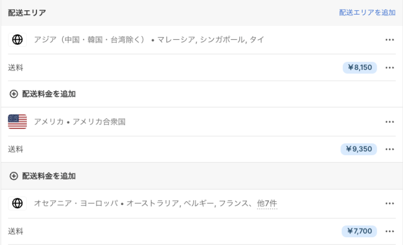 - 配送料金の設定: 国や地域ごとに異なる配送料金を設定します。重さや金額に応じた設定も可能です。