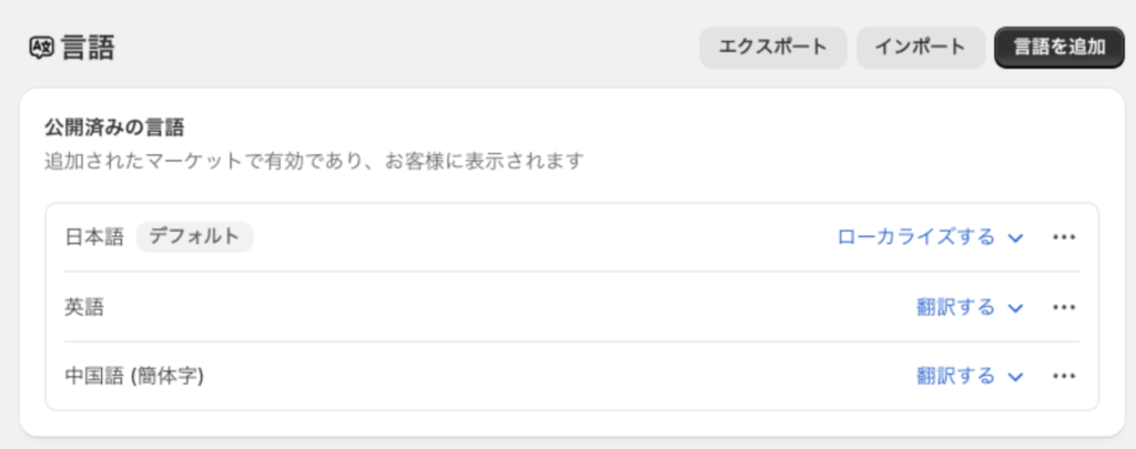 越境ECサイトの購入率を上げるためには、適切に現地語に翻訳する必要があります。一方で、全ての商品を一つ一つ人力で翻訳するのは困難です。そのような中で、Shopifyは、標準機能として多言語対応機能を備えています。