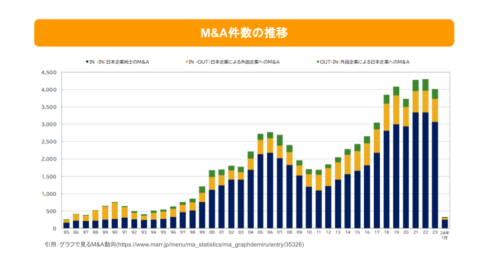 特に2010年代に入ってからは件数が増加し、国内企業同士のM&Aだけでなく、海外企業が関与するM&Aも増えています。2017年にはM&A件数が3千件を記録し、2019年のM&A件数は4千件を突破、コロナウイルス感染症の影響で減少に転じた後の2022年には4,304件に達し、過去最多を記録しました​​。2023年の件数は4,015件と減少しましたが、依然高いペースを維持しています。