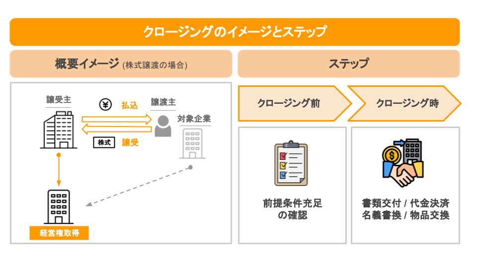 クロージングの手続きは、株式譲渡の場合、譲渡主から譲受主への株式の引き渡しと、譲受主から譲渡主への支払いが核となります。クロージングの詳細は、採用されたM&Aストラクチャーに応じて変わります。