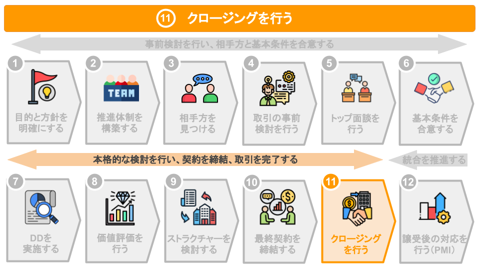「クロージングを行う」ステップは、M&Aの事前検討期間において、「最終契約を締結する」ステップの次に取り組みます。