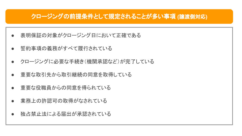 最終契約締結とクロージングが同一日で取引が実行される場合もありますが、通常M&Aは様々な事業、資産・負債、人などが複雑に絡み合った企業や事業を取引するものであり、それらを譲渡する・譲り受けるための最終契約書に盛り込まれた前提条件が満たされていない限り、取引が実行されないという形を取ります。そのためクロージング日までに、前提条件が満たされているかを確認します。