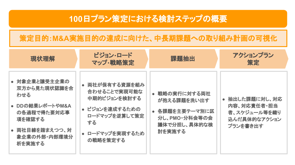 100日プランは、中長期的な課題に取り組むために、クロージング後100日以内に策定する中期経営計画とそのアクションプランを指します。