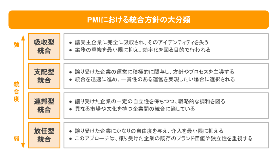 PMIにおける統合方針は、M&A後の企業をどのように統合されるかの指針を定めるものです。主に「吸収型統合」「支配型統合」「連邦型統合」「放任型統合」のアプローチがあると考えられています。統合方針の選択は、目指すシナジー効果、企業文化、業務プロセスの相違などを考慮して決定されます。