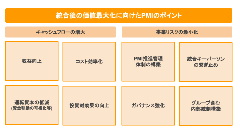 PMIは譲り受けた企業・事業価値の最大化を目的に行われます。価値を最大化していくために、どの分野をより重点的に取り組んでいくか、イメージを持つことが重要です。