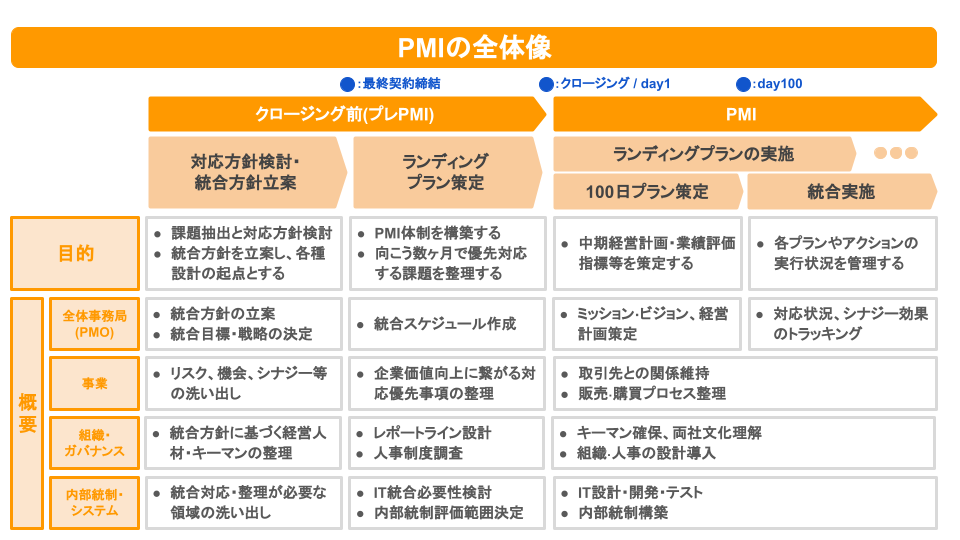 PMI(Post-Merger Integration)は、譲り受け後の経営、業務、及び意識の統合を指し、M&Aによる目的達成やシナジー効果の実現に不可欠な重要なプロセスです。
