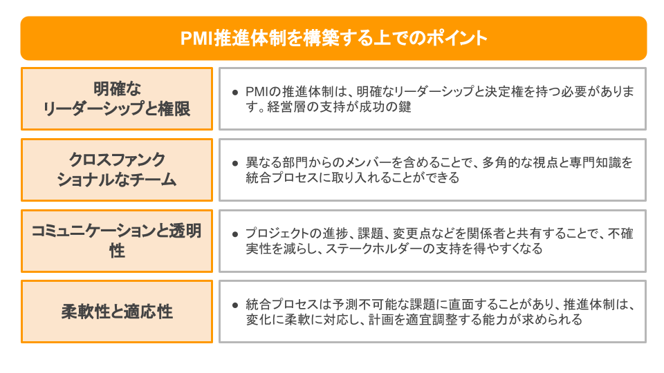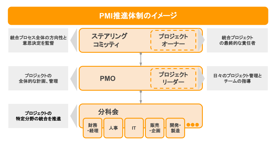 PMIの推進体制は、統合プロジェクトを管理し、戦略的目標達成をサポートするために設置される専門チームや委員会を指します。この体制は、統合の計画、実行、モニタリングを担い、異なる機能間の調整を図ります。推進体制は通常、経営層からの強力な支持を受け、クロスファンクショナルなチームで構成され、各種の専門知識を有するメンバーが参加します。