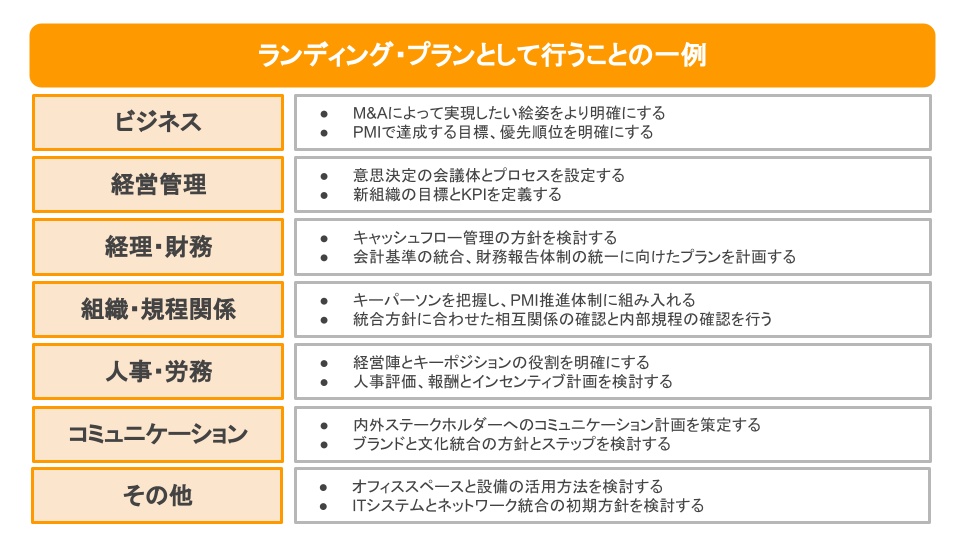 ランディングプランは、クロージング後3〜6ヶ月程度の短期的なタスクリストを作るというイメージを持つと分かりやすいです。短期的に成果の出しやすい分野に集中して、譲受主企業と対象企業が連携してタスクを推進することで、両社が連携する場の土台としても活用ができます。