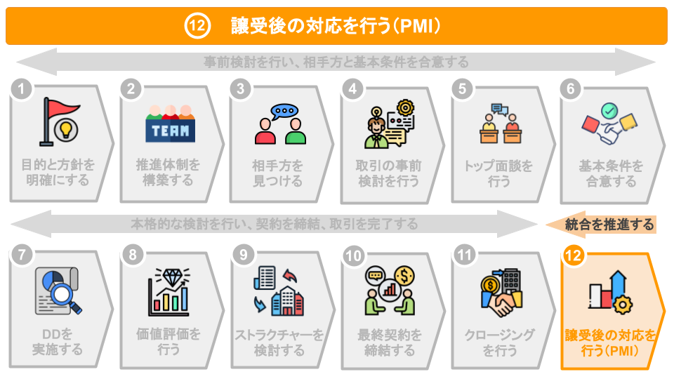 「譲受後の対応を行う(PMI)」ステップは、M&Aの事前検討期間において、「クロージングを行う」ステップの次に取り組みます。