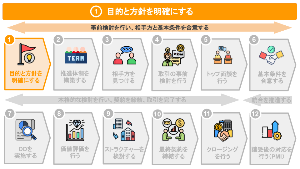 「目的と方針を明確にする」ステップは、M&Aの事前検討期間において、最初のステップとして行います。