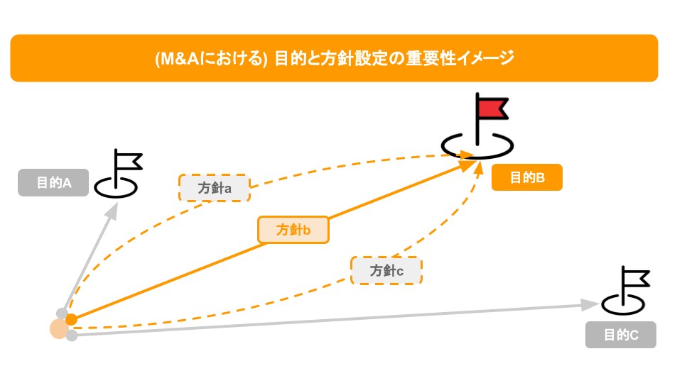 必ずしも一つに限らず様々な目的を兼ねることが多いですが、出来うる限りの優先順位を付けた上で、目的や方針が設定できると、M&Aプロセスにおける難しい比較判断に遭遇した場面で、有効に働きます。