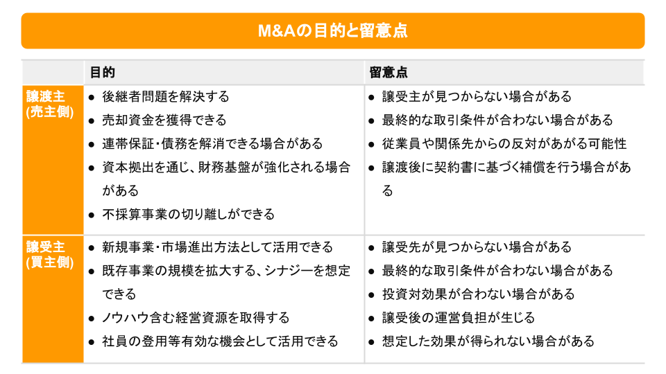 一方で、リスクとしては同様に、相手先が見つからない・条件が合わないことに加えて、譲受後に投資採算が合わない、想定していた効果が得られないということもあります。