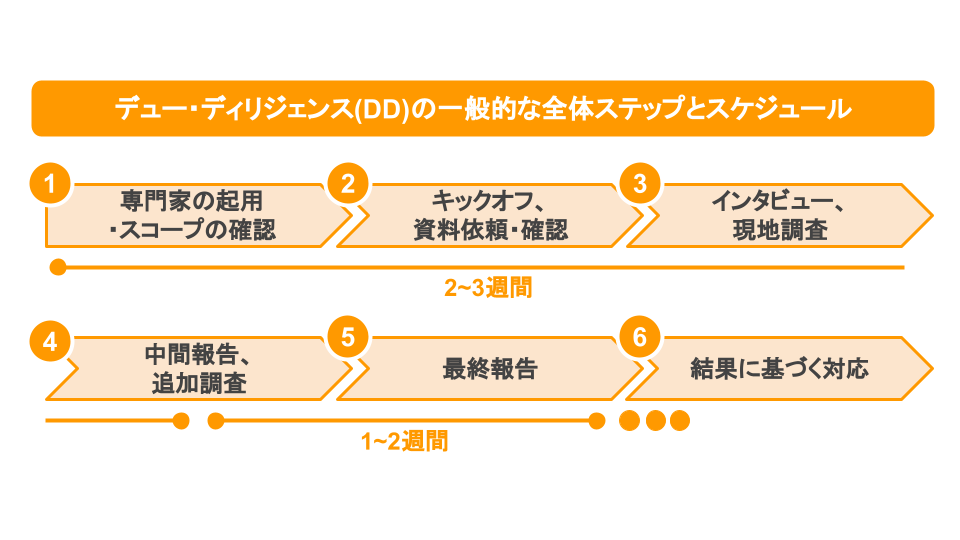 DDのプロセスは、一般的には対象企業・事業の規模が大きいほど、準備や実際の実施期間もそれに応じて長くなります。一般的には、約1ヶ月前後が目安になりますが、調査スコープを限定する場合や対象企業・事業の規模が小さい場合にはそれより短い期間でスピードで完了することもあります。
