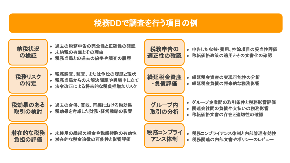 過去の税務申告の完全性、納税状況、税務調査の履歴、繰越欠損金や税額控除の有効性が含まれます。分析項目としては、税務申告書の詳細なレビュー、税務リスクの特定と評価、繰延税金資産と負債の分析、税効果がある取引の検討といった調査が行われます。