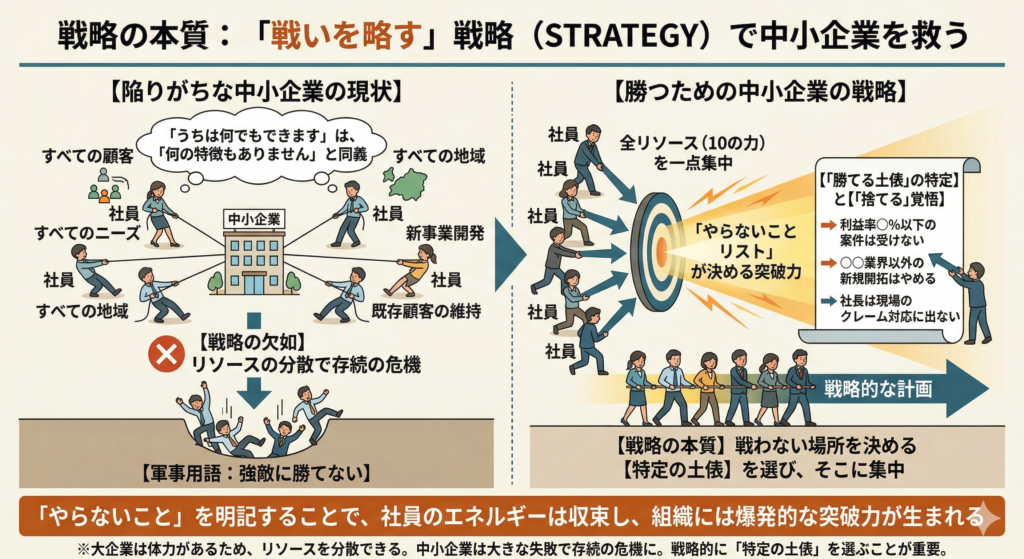 「うちは何でもできます」は、戦略的に言えば「うちは何の特徴もありません」と同義です。 中小企業が勝てる唯一の方法は、「特定の土俵」を選び、そこに全リソースを一点集中させることです。計画を作るプロセスは、この「勝てる土俵」を特定し、それ以外の誘惑を「捨てる」覚悟を決める作業なのです。