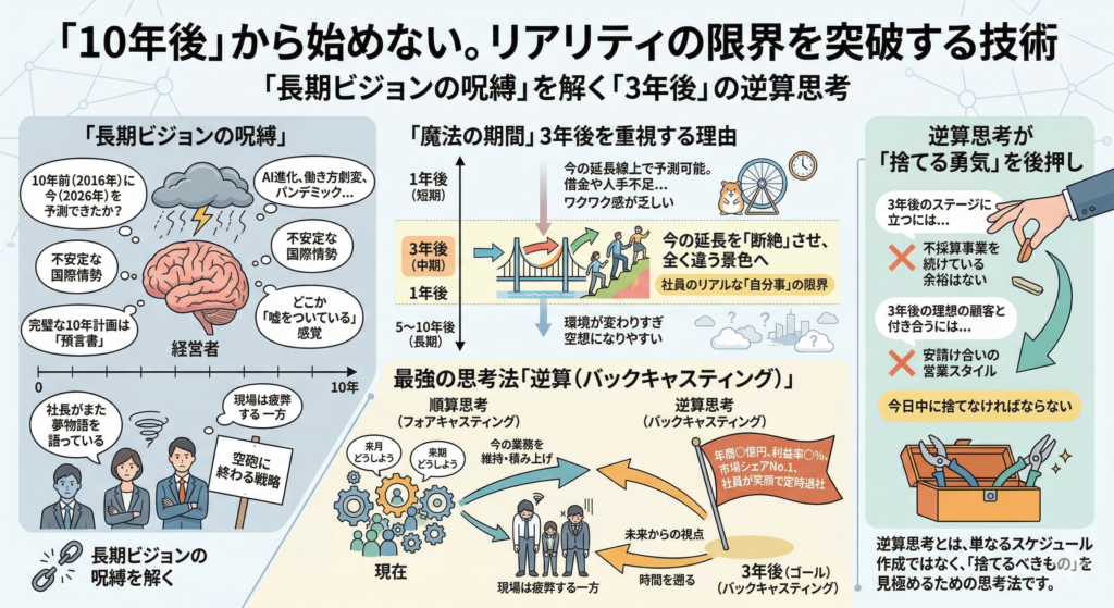 3年後をゴールに設定し、そこから「逆算(バックキャスティング)」を行う。これこそが、中小企業が「捨てるべきもの」を見極めるための、最強の思考法です。