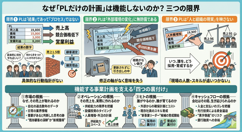 これが、いわゆる「絵に描いた餅の事業計画」です。 数字は並んでいる。体裁も整っている。しかし、その数字を支える「なぜ実現できるのか」という根拠が希薄な状態です。損益計算書(PL)は作れましたが、計画の「中身」がない状態といえます。